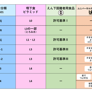 介護食品と呼ばれる食品の範囲を整理して2015年より農林水産省が整備した枠組み。健康維持上栄養補給が必要な方向けの食品(青マーク)、JAS規格に適合した噛むことに問題がある方向けの食品(黄マーク・4段階)、特定用途食品の許可が必要な飲み込むことに問題がある方向けの食品(赤マーク・3段階)の3種類に分類されています。いずれもマークの使用には農林水産省への利用申請が必要です。