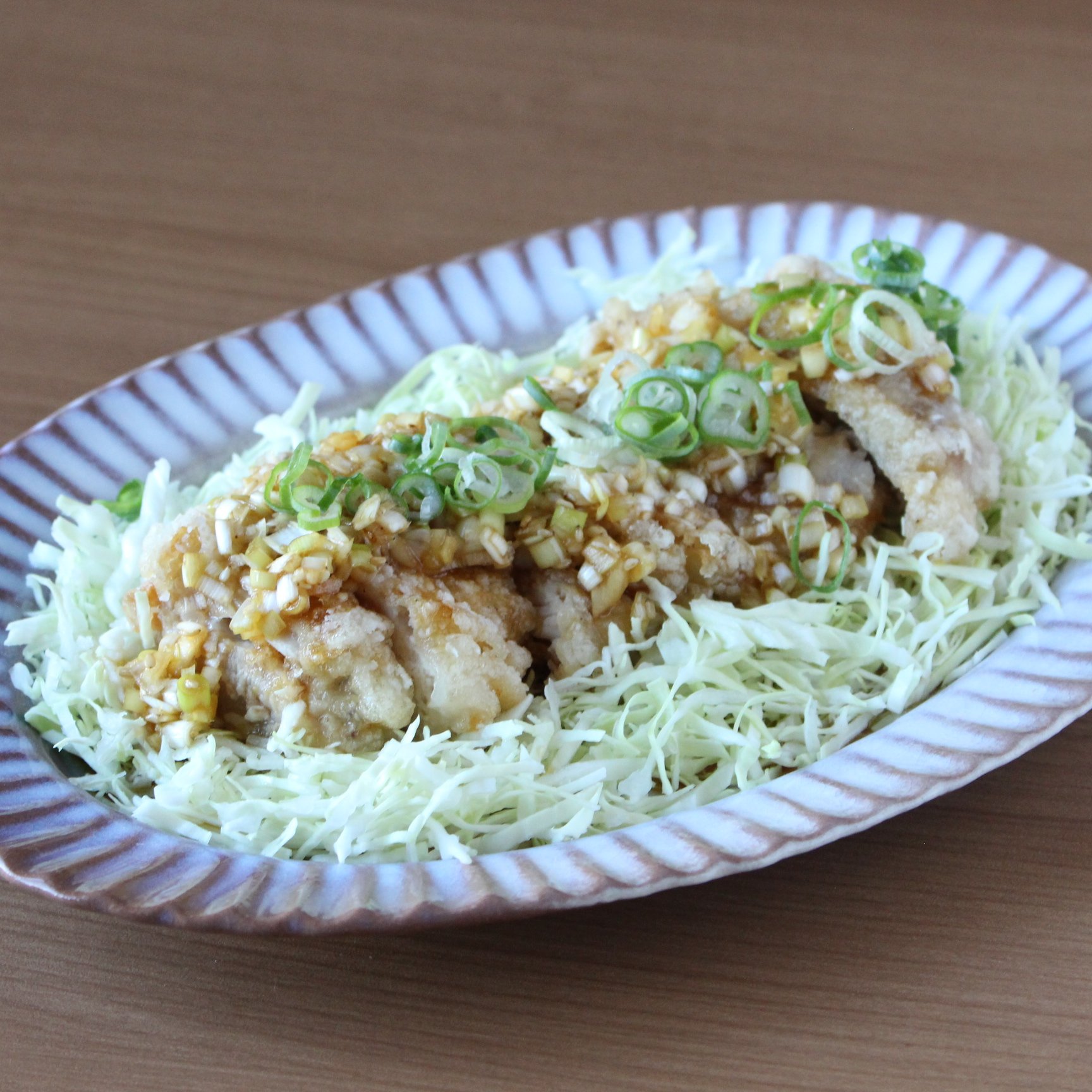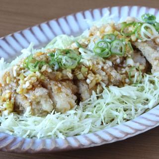 5. 器にキャベツを敷き、鶏肉を盛り、ソースをたっぷりとかける。青ねぎを散らして完成。